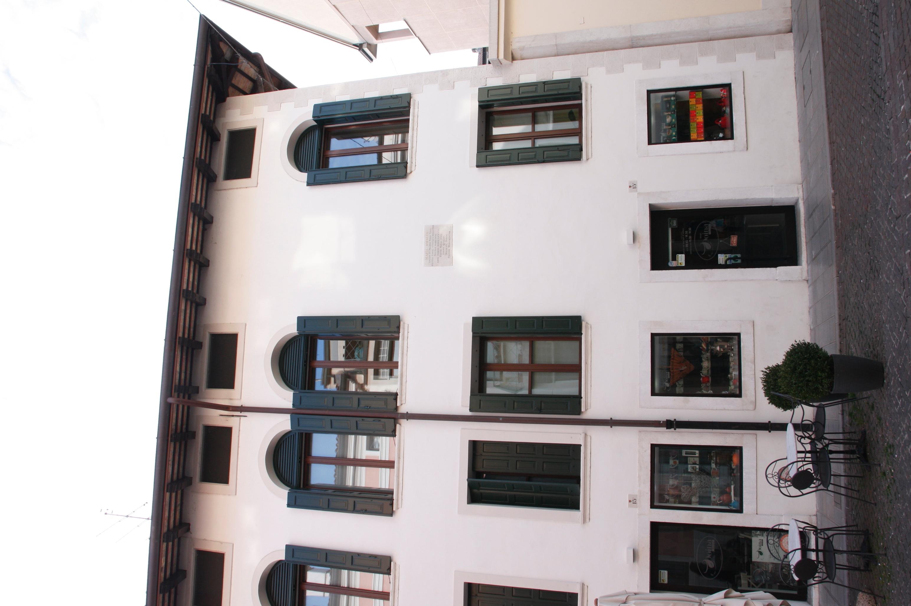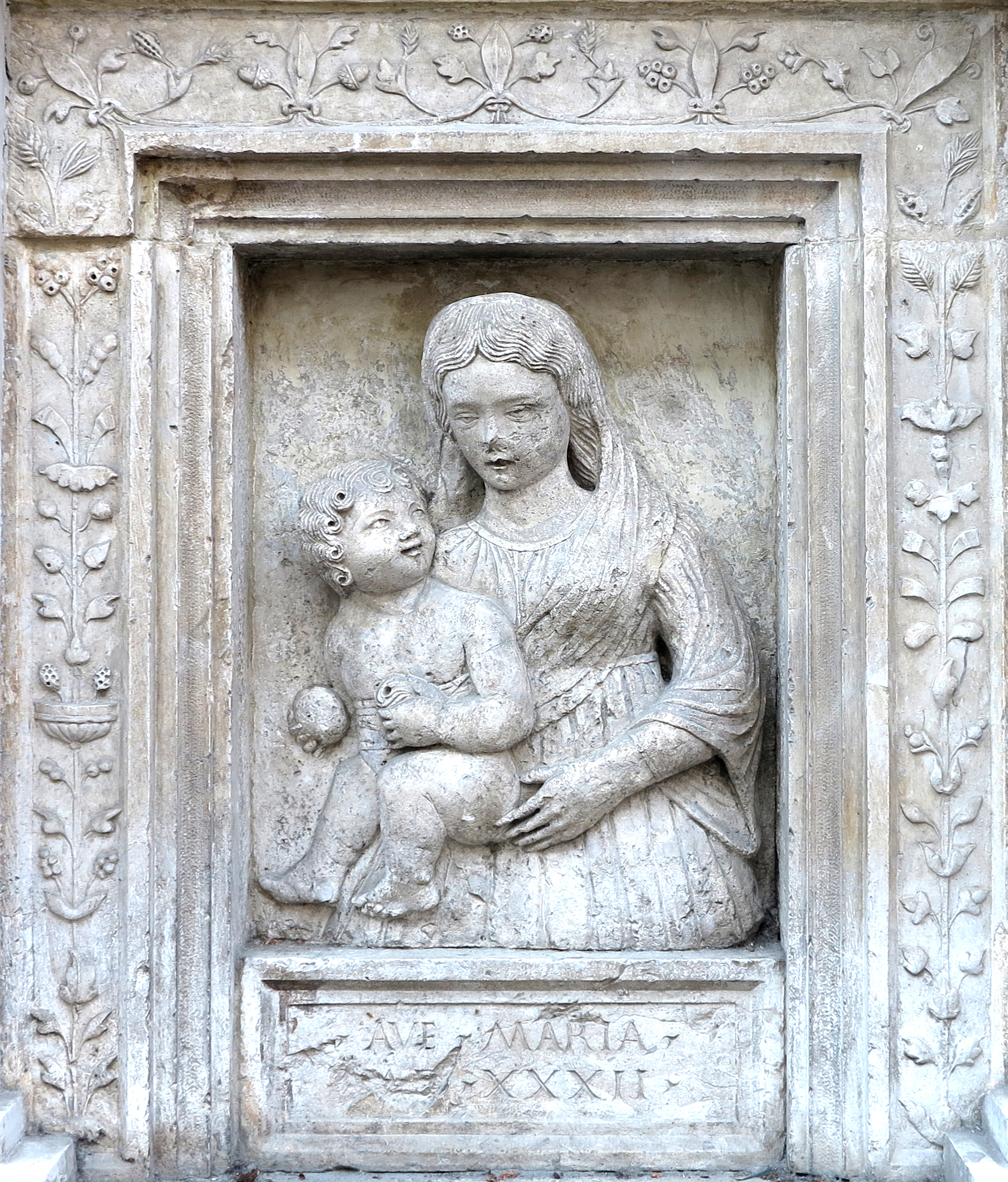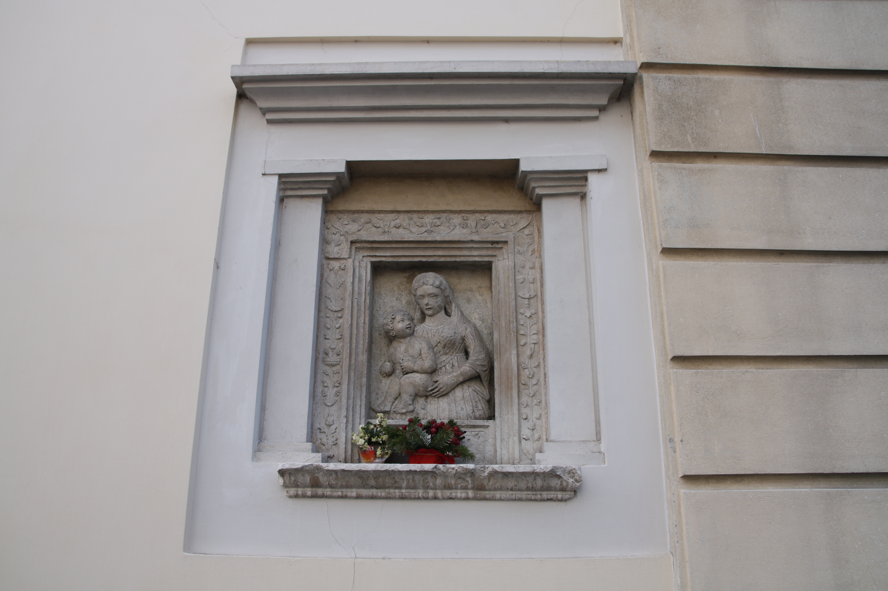 Nella piccola facciata dell’edificio successivo è inserita un’edicola devozionale in pietra serba la Madonna col bambino di Carlo da Carona (1485-1555).