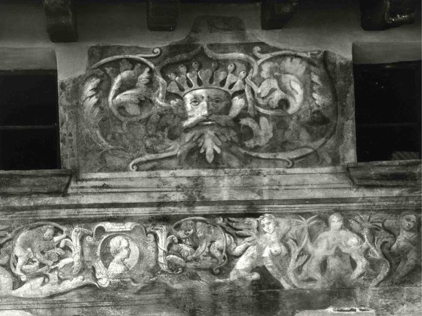 Sull’intonaco del paramento ad affresco del sottogronda è riapparsa la data 1559. L’opera potrebbe essere di Antonio Sacchiense nipote del grande Pordenone. Nell’ampio riquadro sottostante a destra, la scena molto deperita di Milone dilaniato dal leone.