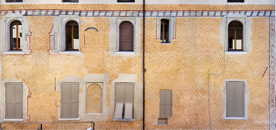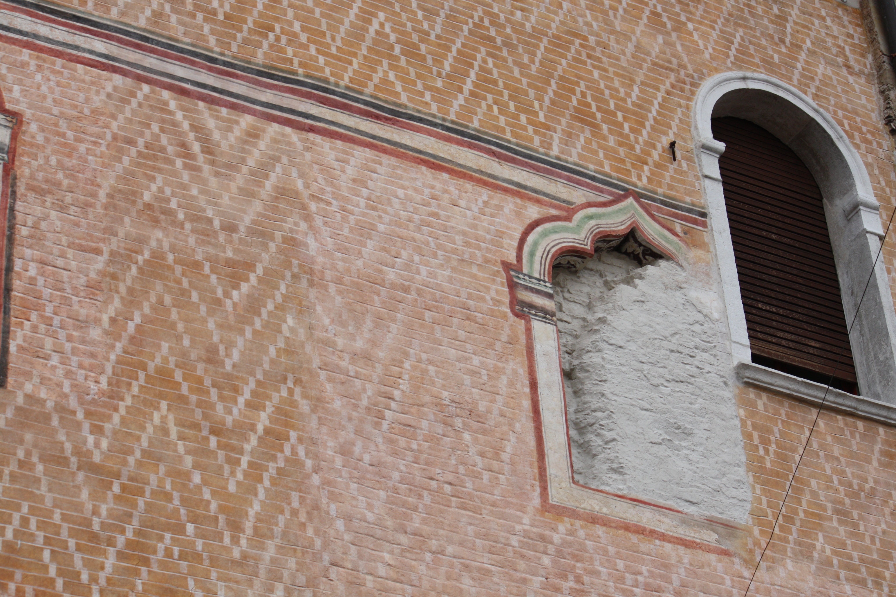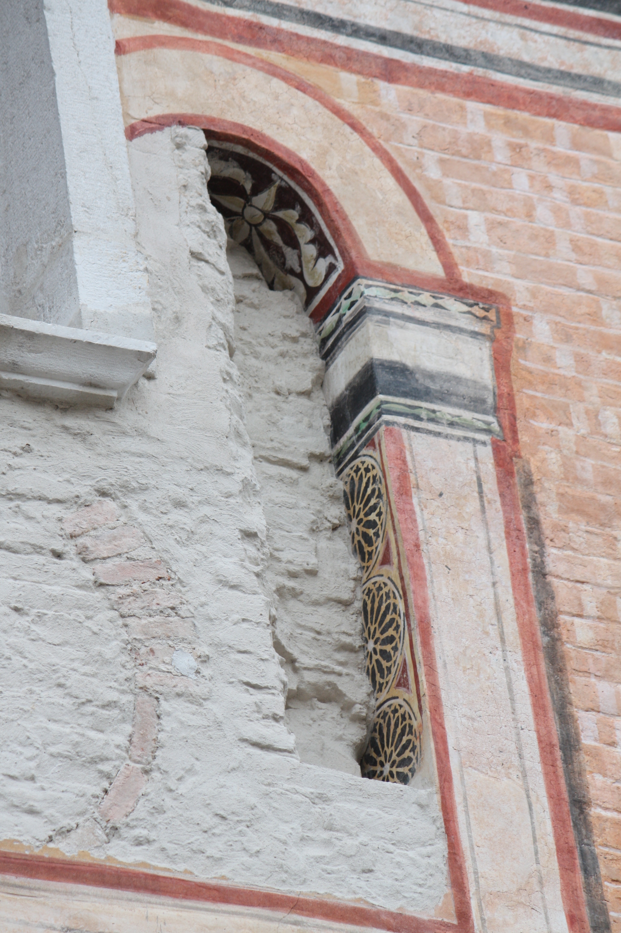 La facciata presenta partiture affrescate che consistono in brani significativi costituiti da fregi a motivi floreali alternati a racemi a coronamento della più ampia superficie costituita da una decorazione a finta mattonatura, tecnica in uso nel Medioevo.