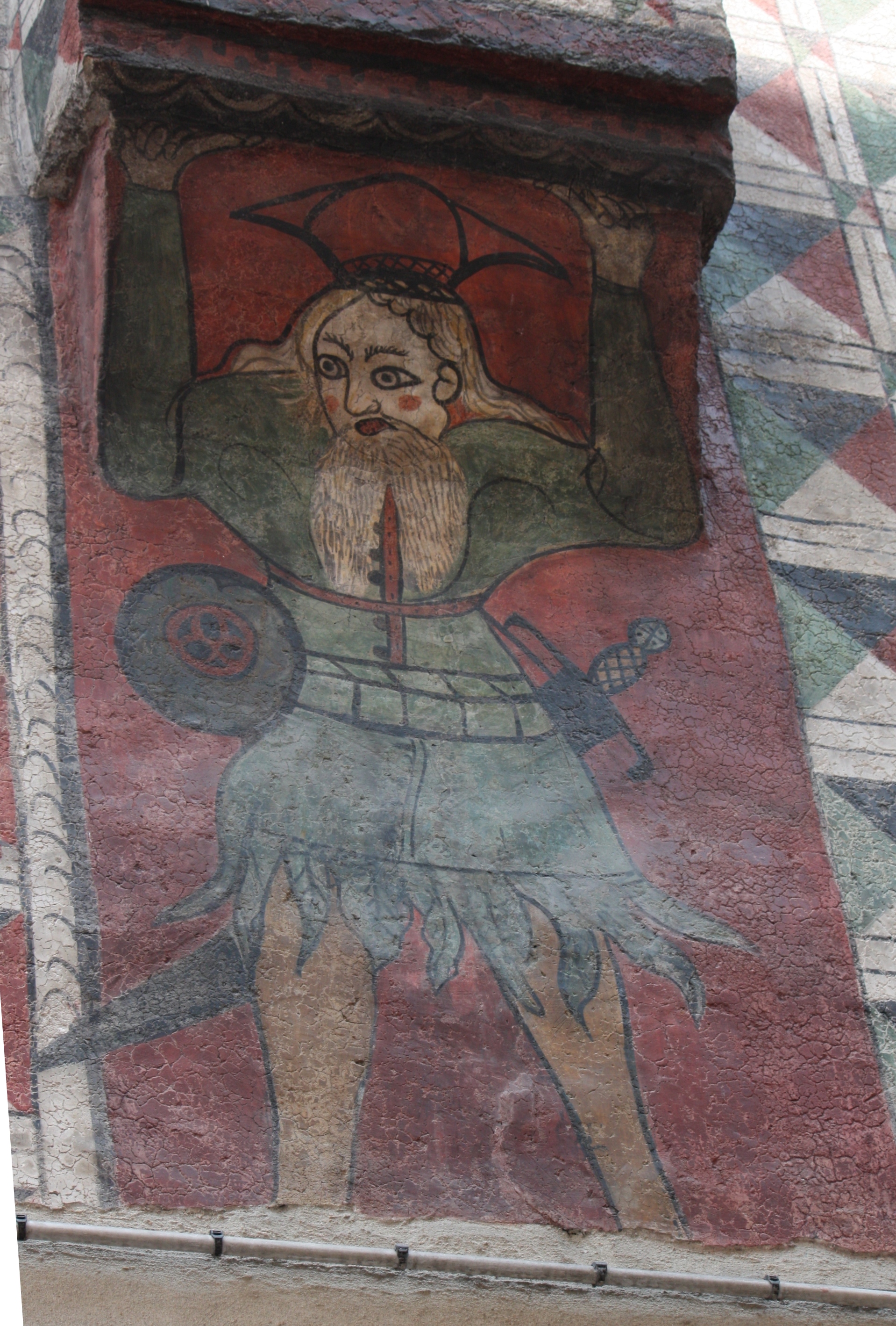 Sul lato verso via del Castello, in corrispondenza della canna fumaria, c’è il grottesco Telamone di gusto nordico.
