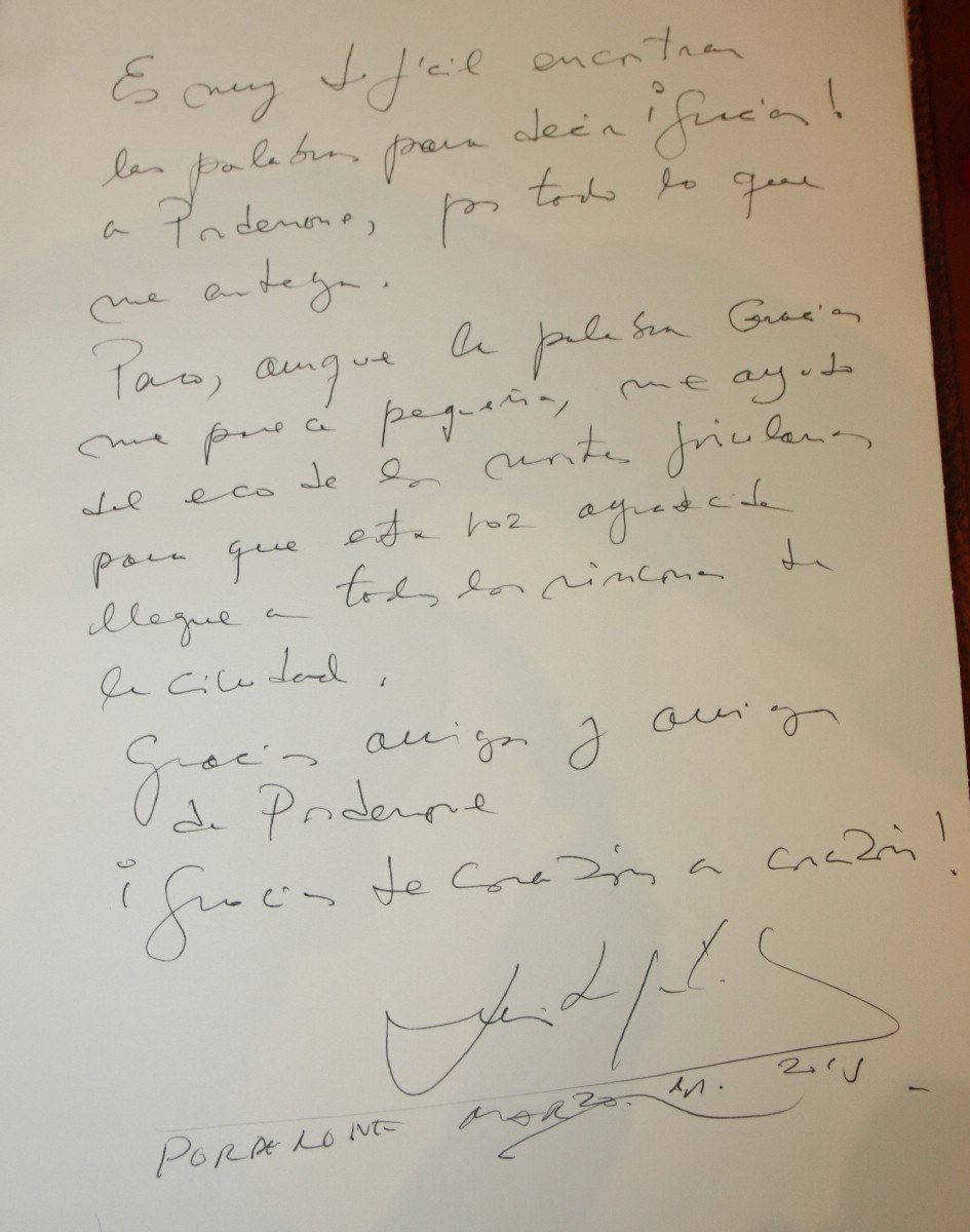 Questo il messaggio che lo scrittore ha lasciato sul Libro d'onore del Comune di Pordenone: