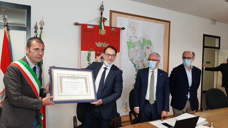 Il sindaco Alessandro Ciriani ha consegnato il sigillo della città all’ospedale di Pordenone «quale simbolo di solidarietà e professionalità pordenonesi – ha spiegato - dimostrate durante il Covid-19. Lo consegno altresì a tutti i cittadini che hanno lavorato in prima linea a Pordenone, in qualsiasi settore e ambito, e lo consegno alla città, per la responsabilità e civiltà che l’hanno caratterizzata nel corso della pandemia».