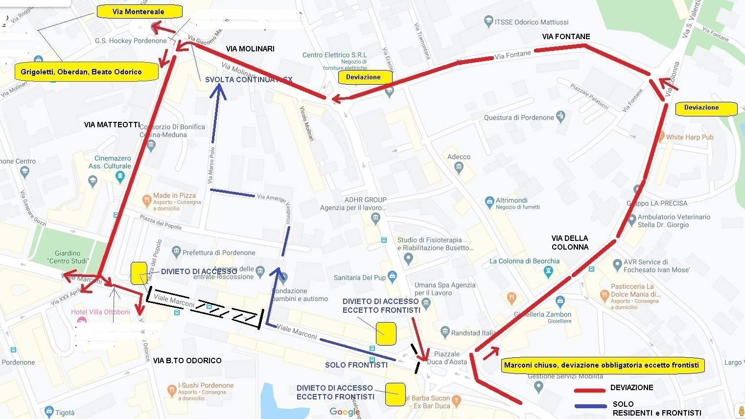 Il traffico da piazza Duca d’Aosta viene incanalato lungo l’anello costituito dalle vie Colonna, Fontane, Molinari, Matteotti. Qui, al semaforo dei giardinetti del centro studi, si potrà andare dritti, svoltare a destra e anche a sinistra per entrare in via Beato Odorico. Tutte le deviazioni sono indicate sul posto.