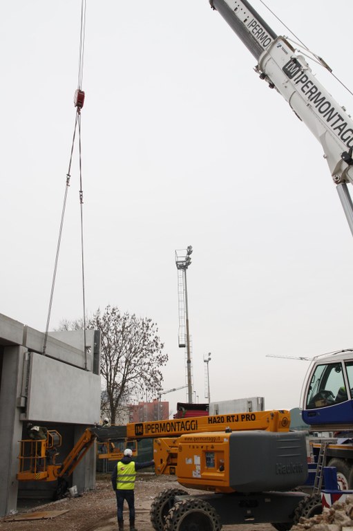 Le fondamenta sono state gettate lo scorso settembre ed ora con la posa dei pannelli prefabbricati in tre giorni il nuovo edificio sta prendendo forma. Sorge nel retro della scuola Rosimi e a fianco della palestra del Palazen, ha una superficie di oltre 400 metri quadrati strutturata con una sala polifunzionale di 200 mq, in grado di contenere 180 persone, che all’occorrenza, con pannelli divisori potrà essere trasformata in tre spazi da circa 70 mq ciascuno per ospitare incontri, eventi ed attività ginniche, quindi sia a servizio della scuola che per il Palazen dove si pratica lo judo. Un’area ingresso con porticato, locali di servizio e una zona soppalcata di circa 109 m2 accessibile tramite una scala aperta, completano l’opera.
