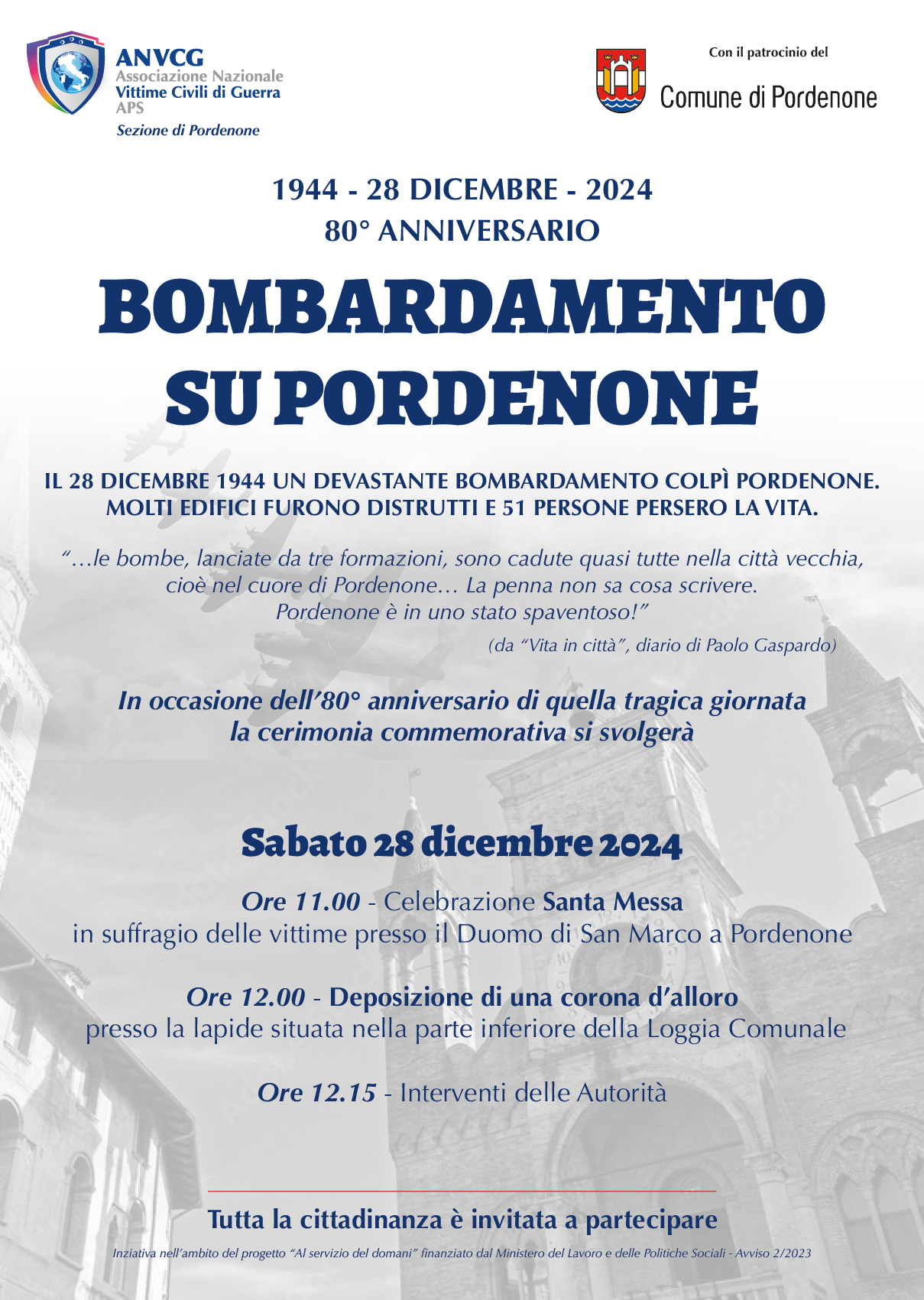 Dopo la messa in Duomo, alla quale parteciperanno parenti e amici dei pordenonesi morti sotto le bombe, l’assessore comunale Mattia Tirelli e le associazioni d’arma, la cerimonia proseguirà sotto la loggia del Municipio, dove si svolgerà la commemorazione con la deposizione di una corona d’alloro alla lapide che ricorda tutte le vittime innocenti della Seconda Guerra Mondiale. Presente anche il Gonfalone del Comune di Pordenone.