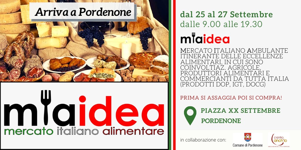 Da venerdì 25 a domenica 27 Settembre in piazza XX Settembre a Pordenone dalle 9 alle 19.30 anche in caso di pioggia, si terrà l’evento del M.I.A. “Mercato Italiano Alimentare” organizzato in collaborazione con il Comune di Pordenone e Sviluppo e Territorio.