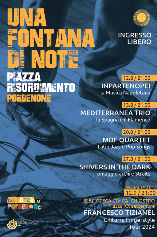 L’intera programmazione ha la guida artistica del M° Francesco Tizianel, che il 12 dicembre nel chiostro della Biblioteca civica offrirà alla città di Pordenone un evento speciale a chiudere le due rassegne. Il chitarrista e compositore, impegnato da giugno in un tour italiano ed europeo, porterà nella sua città natale uno spettacolo che condenserà i suoi ultimi tre progetti nel mondo della chitarra fingerstyle. E la mattina del giorno successivo, all’interno del programma “LIBERA LA CULTURA” elaborato anche con la Biblioteca Civica del Comune di Pordenone, si esibirà alla Casa Circondariale in uno spettacolo per i detenuti.