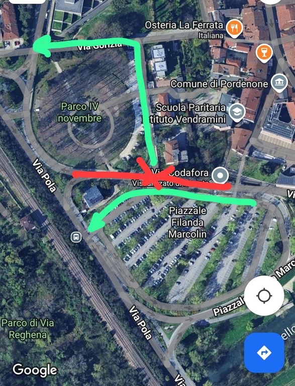 La nuova viabilità coinvolgerà anche coloro che dovranno immettersi in via Cappuccini e che, non potendo più imboccare la strada da via Codafora, dovranno transitare per l’anello circolatorio e quindi percorrere: via Riviera del Pordenone, viale Dante, via Marconi, via Oberdan e rientrare dalla stazione dei treni imboccando il sottopasso da via Pola.