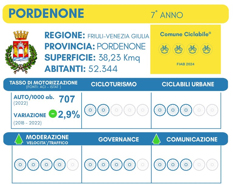 Entrata a far parte dei Comuni Ciclabili fin dalla prima edizione, Pordenone conferma anche quest’anno il punteggio di 4 bikesmile, grazie al raddoppio della superficie a Zona 30 con l’inserimento di elementi di moderazione di velocità (come le intersezioni rialzate sulle strade di scorrimento rimaste a 50 km/h) e al minor numero di eventi motoristici patrocinati.