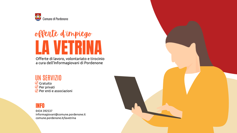 Prima della pubblicazione, gli annunci saranno vagliati dall’Informagiovani, che garantirà il rispetto delle normative in materia di lavoro, volontariato e parità di genere. Al servizio si accede dalla home page del sito del Comune di Pordenone alla sezione “Da sapere”. Per consultare gli annunci pubblicati: www.comune.pordenone.it/lavetrina , mentre l’elenco delle offerte è disponibile al link www.comune.pordenone.it/segnalaofferta