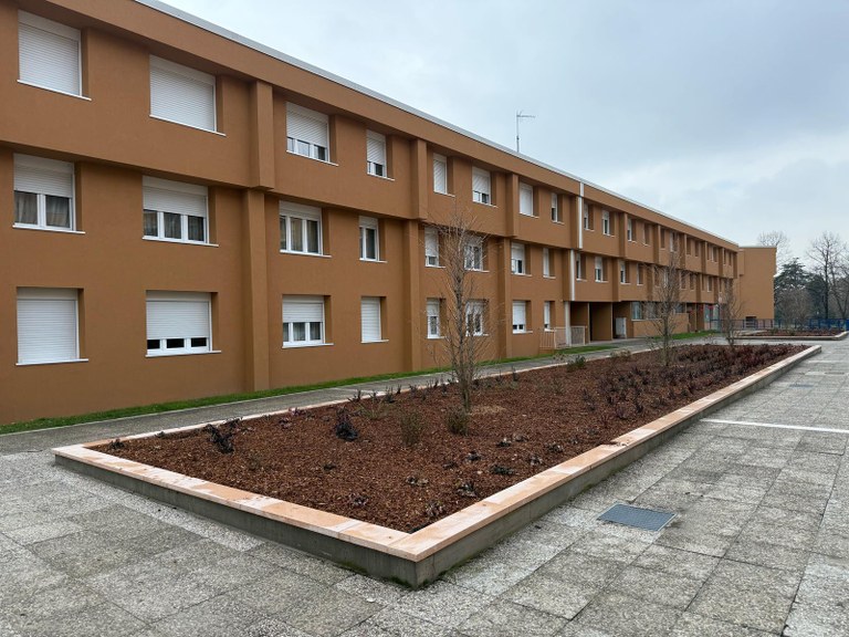 I residenti avevano richiesto uno spazio esterno comune con del verde e più ombreggiato – riducendo l’effetto “isola di calore estivo” causato dalla grande presenza di cemento – e collegando con rampe per disabili e anziani i vari livelli del piazzale esistente. A quel punto sono stati intercettati i fondi PNRR e si è partiti con l’opera di riqualificazione dell’area esterna. I lavori hanno portato alla messa a dimora di 5 alberi, di 86 arbusti e diverse centinaia di piante tappezzanti, alla creazione di due aiuole in sostituzione delle superfici pavimentate, alla demolizione della scalinata esistente e alla realizzazione di una nuova, con l’inserimento di una rampa dotata di parapetti e corrimano per il superamento delle barriere architettoniche.