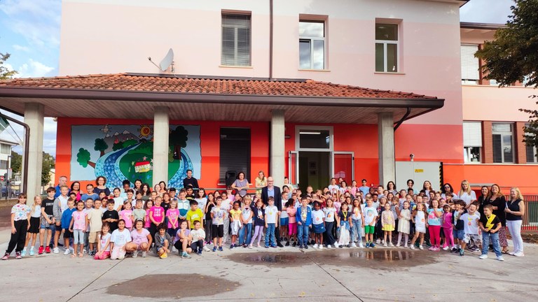 È seguita poi la visita alla primaria Gaspare Narvesa di via Fonda, già oggetto di una profonda ristrutturazione e di un importante adeguamento antisismico che l’ha resa sicuro punto di riferimento, non solo per gli alunni e gli insegnanti che la frequentano, ma anche per l’intera comunità. Qui è stato possibile visitare il nuovo giardino retrostante alla scuola, costituito da un bel prato su cui sorgono grandi alberi e dal nuovissimo e coloratissimo campo da gioco polifunzionale con superficie in gomma colata, su cui i bambini potranno giocare a basket e pallavolo. Infatti nelle prossime settimane verranno montati sul campo due canestri da basket e la rete da pallavolo.