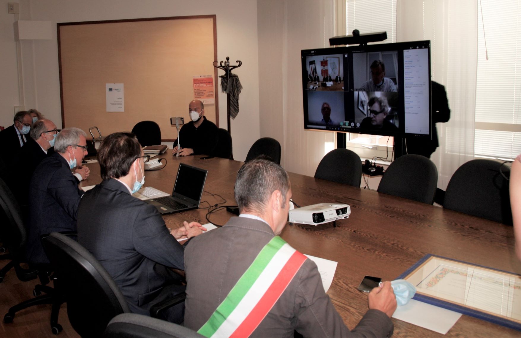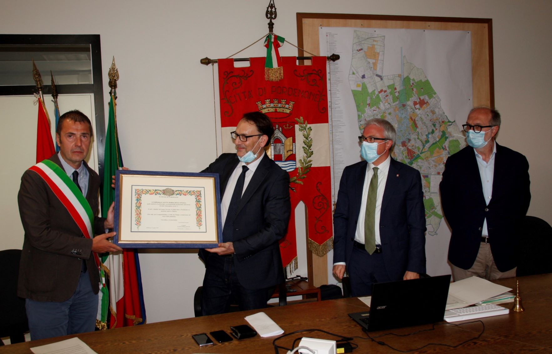 Il Sindaco Alessandro Ciriani consegna il Sigillo della città al direttore generale Joseph Polimeni alla presenza dell'assessore regionale Riccardo Riccardi e del presidente del Consiglio comunale Andrea Cabibbo. La cerimonia si è tenuta in sala Giunta in collegamento telematico con i consiglieri comunali, il dott. Guido Lucchini presidente Ordine medici chirurghi e odontoiatri Provincia di Pordenone, il dott. Luciano Clarizia presidente Ordine Infermieri Destra Tagliamento e Responsabile del Servizio Professionale AOSF e il dott. Lucio Bomben direttore del dipartimento di prevenzione.