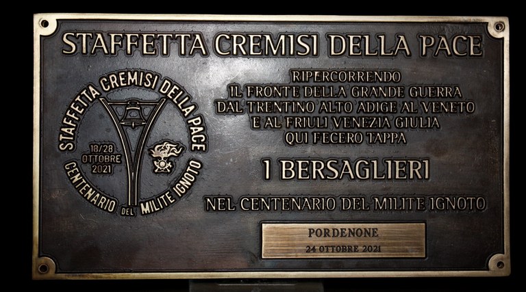 Per celebrare il Centenario della traslazione della salma del Milite ignoto dal cimitero di guerra di Aquileia al Vittoriano in Roma, le presidenza regionali dell’Associazione Nazionale Bersaglieri del Trentino Alto Adige, Veneto e Friuli Venezia Giulia, hanno organizzato la Staffetta Cremisi della pace: Si tratta di un percorso in undici tappe da Trento a Trieste che andrà a toccare alcuni dei luoghi di memoria più significativi della I^ guerra mondiale. A Pordenone, città significativa per i Bersaglieri farà tappa domenica 24 ottobre con una cerimonia in piazzale Ellero e la consegna al Sindaco della targa commemorativa dell’evento e di un DVD con immagini storiche provenienti dalla Cineteca del FVG e dell’Istituto Luce da consegnare alle scuole per diffondere fra gli studenti l’alto valore storico della memoria. Ed è anche con questa finalità che il presidente regionale dell’ANB (Associazione Nazionale Bersaglieri) gen. Pino Iacca, ha illustrato nella sua interezza il significato della manifestazione che vuol tener vivo il ricordo del sacrifico di molti militari.
