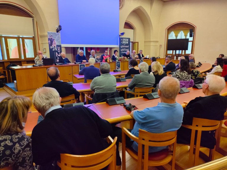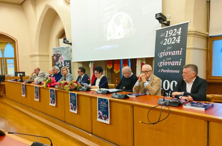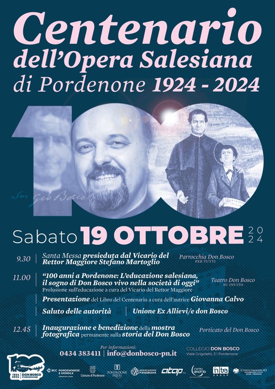 In seguito alla proiezione del video dedicato al centenario realizzato da Maurizio Perrotta con le musiche di Luca Buosi, è stato presentato l’evento che si terrà sabato 19 ottobre presso il Collegio Don Bosco. Appuntamento per tutti alle 9.30 con la celebrazione della Messa presieduta da don Stefano Martoglio, vicario del Rettor Maggiore. Alle 11.00 lo stesso vicario condividerà la sua testimonianza e un messaggio di speranza sul sogno di Don Bosco, vivo nella società di oggi. A seguire Giovanna Calvo di Ronco presenterà a tutti il libro sul centenario e alle 12.45 sarà inaugurata la mostra fotografica permanente sulla storia dell’Istituto Don Bosco, punto di riferimento educativo, culturale e sociale per tante generazioni di Pordenone.