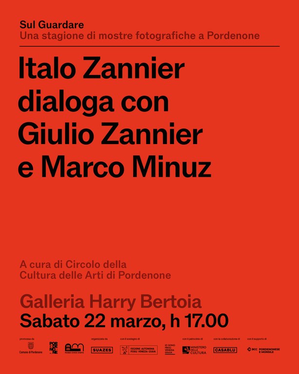 Nella stessa cornice espositiva, sabato 22 marzo alle ore 17:00, nell’ambito della mostra fotografica “Italo Zannier – Io sono io. Fotografo nella storia e storico della fotografia”, Giulio Zannier e Marco Minuz, dialogheranno con il maestro Italo Zannier, figura di riferimento per il riconoscimento della fotografia nel nostro Paese. L’incontro, a cura del Circolo della Cultura delle Arti di Pordenone, offrirà uno sguardo privilegiato sull’universo visivo e culturale di Italo Zannier, figura di riferimento nel panorama fotografico italiano, capace di coniugare rigore scientifico e grande entusiasmo per l'immagine. Un dialogo aperto con il pubblico per scoprire la genesi della mostra e le storie che si celano dietro le immagini esposte. Un'occasione per approfondire il percorso di sviluppo del progetto espositivo attraverso racconti, aneddoti e riflessioni sulla fotografia.