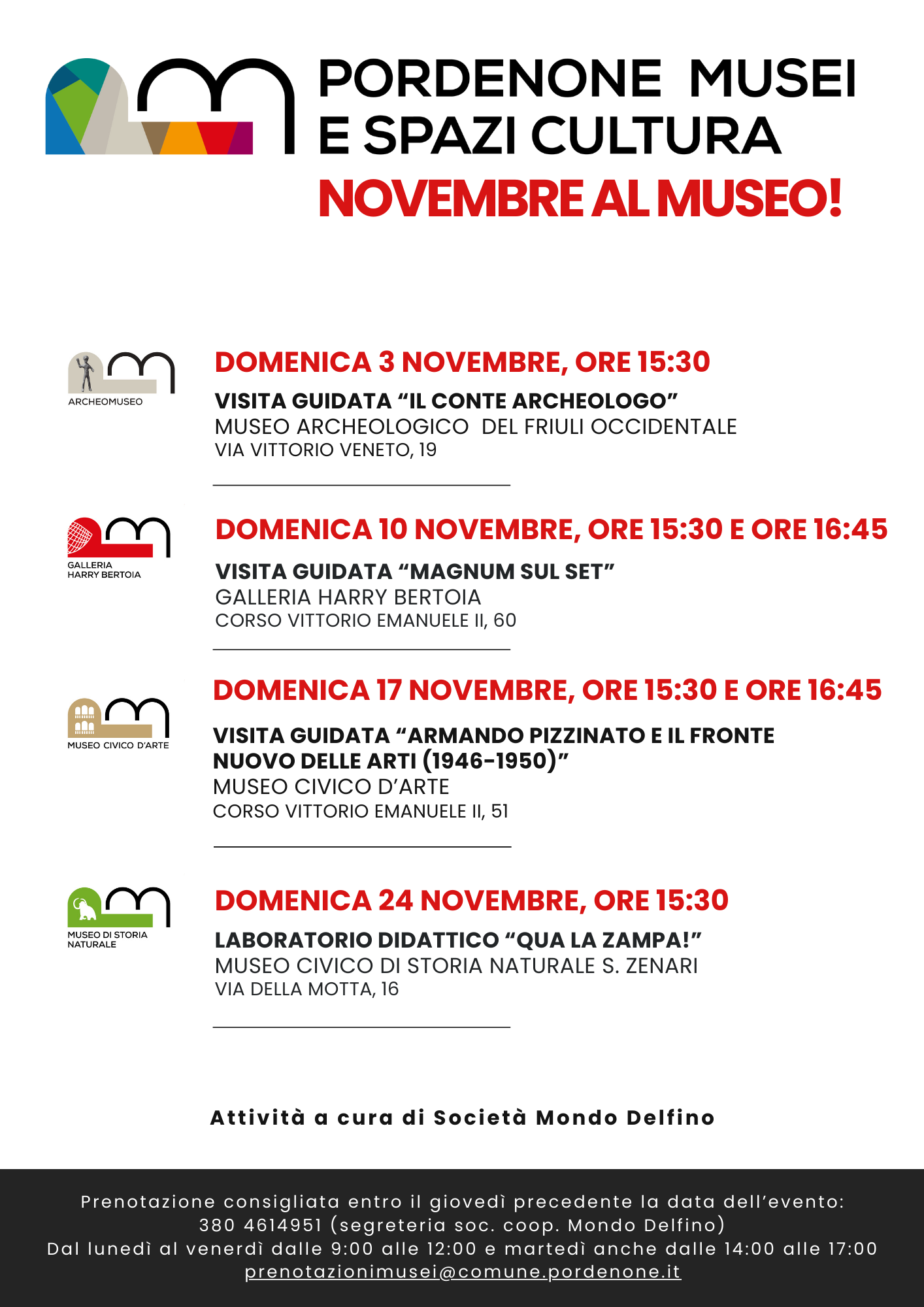 Nuove occasioni culturali arricchiscono il calendario delle proposte del prossimo novembre, con visite guidate e laboratori didattici, con inizio alle ore 15:30 e prenotazione consigliata attraverso il form on-line accessibile al sito www.mondodelfino.it.